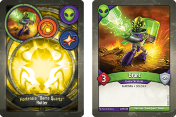 Some card abilities in Winds of Exchange will instruct players to "make a token creature", at which point a card from the top of the deck is put into play to represent a copy of that deck's token creature. The card backs of Winds of Exchange decks have been modified from previous sets, to include an art reference to its Token Creature.
